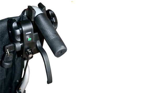 Mediante una palanca situada debajo del puño podemos accionar el motor, regulándole la velocidad y adecuándola a nuestro paso. Con un sencillo sistema se puede desacrtivar, dejandolo en el aire y manipulando la silla como si no tuviera motor.